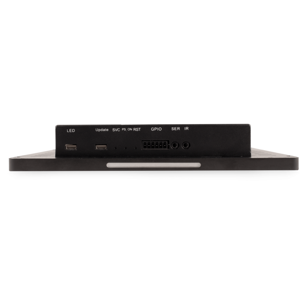 Netzwerk (Gbit/ PoE+), WLAN optional, USB, RS232, 4 GPIO, IR (In/ Out)