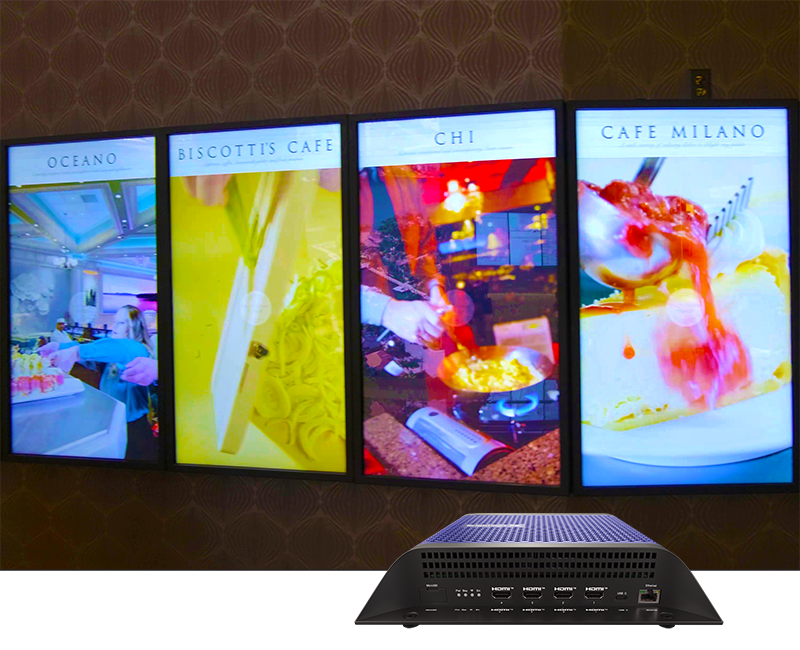 Wiedergabe von Videos und Bilder mit 8K@60Hz 8 bit Auflösung auf 2 HDMI Ausgängen. Die XC5 Mediaplayer haben die stärkste HTML5 Elite Engine. Speziell entwickelt für Videowände und LED Wände. Die neue Bildrotation ermöglicht einfachstes Handling. Einfügen und ändern von Inhalten über Netzwerk via BrightAuthor oder easescreen (soweit eingebunden). Aufruf von einzelnen Sequenzen über Netzwerk. Aufruf von einzelnen Sequenzen über GPIO, RS232, USB, USB Touchdisplays. Es können auch mehrere Geräte via Netzwerk synchronisiert werden. Terminierung von Abspielsequenzen, Online Reports, Textticker, RSS-Feed und Twitter Feeds verfügbar. Statistikaufzeichnung und Weltzeitangabe mit Datum möglich.