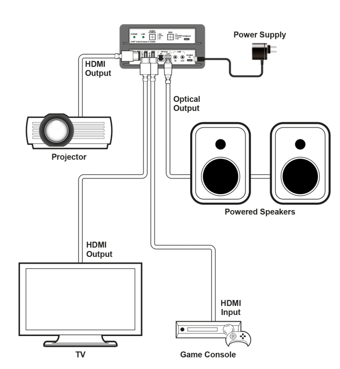 Der Embedder/De-embedder ermöglicht es sowohl ein Audio Signal (ARC v. Ausgang 1, optisch oder analog) vom eingehenden Signal zu de-embedden oder aber ein eingehendes analoges oder digitales Signal in das ausgehende HDMI zu embedden. Das EDID Management erlaubt es aus 4 Voreinstellungen eine Auswahl vorzunehmen.