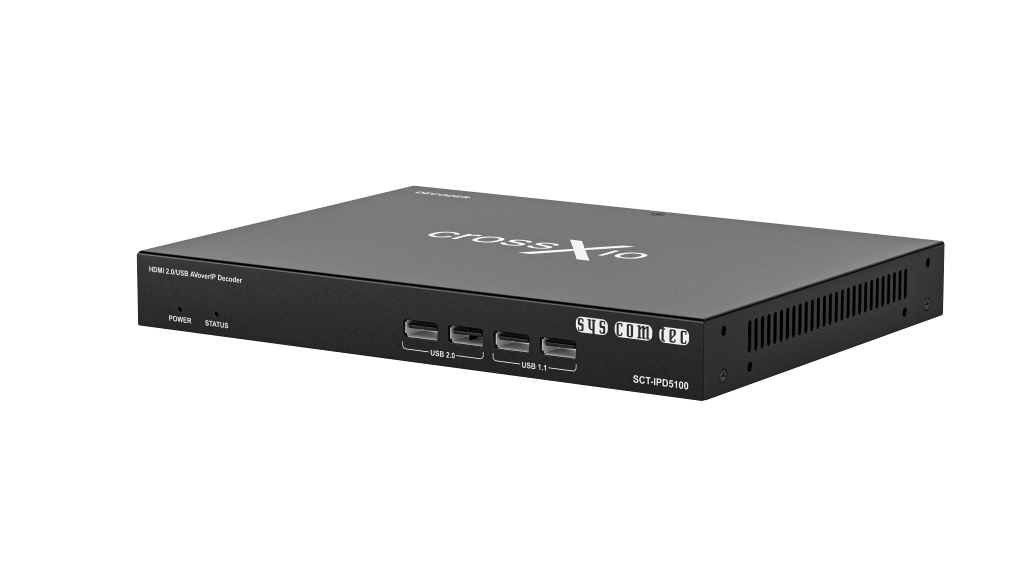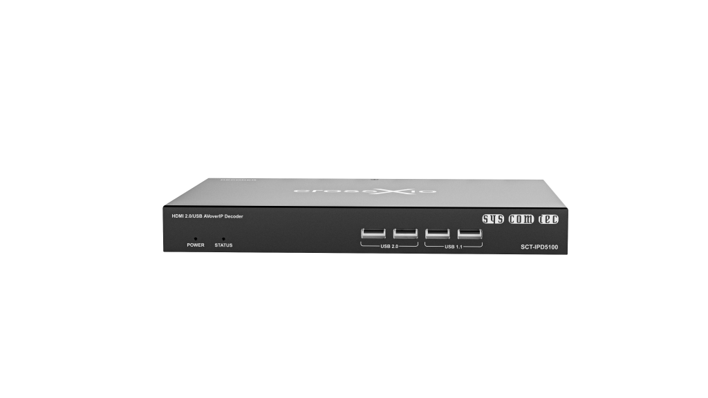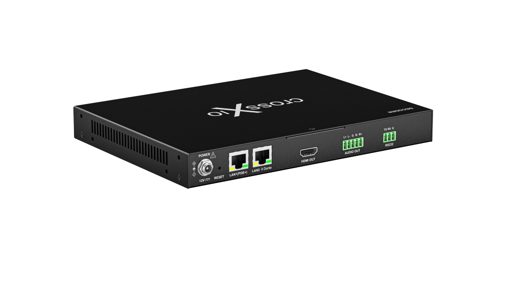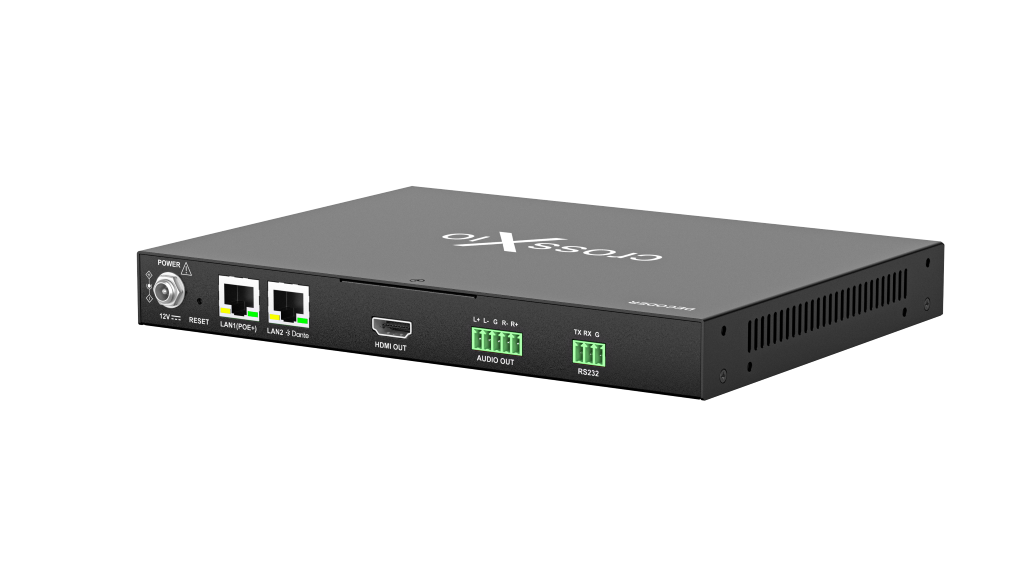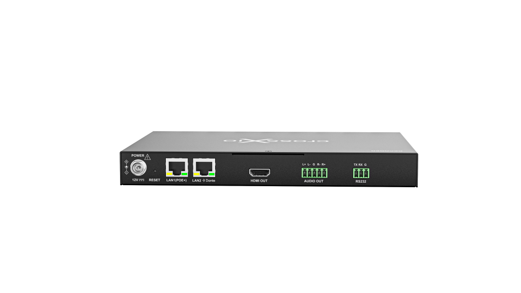 Der AVoverIP Decoder aus der 1G crossXio Serie empfängt ohne spürbare Latenz ein HDMI2.0 Videosignal mit analogem oder Dante/AES67 Audio und USB2.0/1.1. Der integrierte VideoScaler mit Rotationsfunktion (90°/180° & 270°) unterstützt Auflösungen bis 4K@60Hz 4:4:4. Videowand-Funktion bis max. 16x16. Audio deembedding für symmetrisches analoges Audio, Dante oder AES67. Mit USB2.0/1.1 Option für KVM Routing ausgelegt für USB2.0 Kameras.