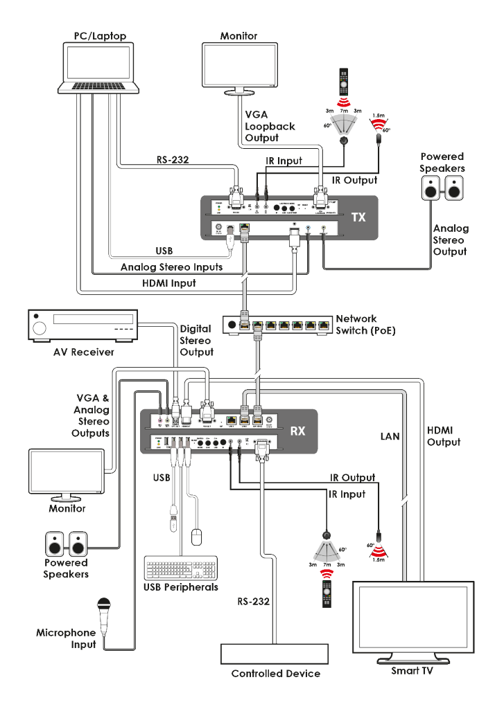Der LAN Transmitter ermöglicht die Übertragung eines HDMI oder VGA, RS232, IR und eines USB1.1/ 2.0 über ein CAT5e, CAT6 oder CAT7 Kabel soweit die Gigabit- Netzwerkinfrastruktur dies ermöglicht (Punkt zu Punkt Lösungen ohne Netzwerkswitch max. 100m). Für den sicheren Betrieb benötigt das Systems eine eigene Netzwerkinfrastruktur/ VLAN um die Bandbreite von ca. max. 220 Mbps (3840x2160@30Hz, RGB 4:4:4) optimal zu verarbeiten. Die Stromversorgung erfolgt über ein Steckernetzteil oder PoE. Es können mehrere Transmitter mit mehreren Receivern verbunden werden. Der Netzwerkswitch muss folgendes unterstützen: Gigabitswitches mit IGMP Snooping (als Querier), V-LAN Fähigkeit und 8K Jumbo Frames.