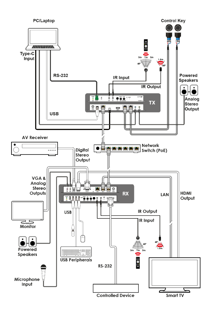 Der LAN Transmitter ermöglicht die Übertragung eines USB-C oder HDMI, RS232, IR und eines USB1.1/ 2.0 über ein CAT5e, CAT6 oder CAT7 Kabel soweit die Gigabit- Netzwerkinfrastruktur dies ermöglicht (Punkt zu Punkt Lösungen ohne Netzwerkswitch max. 100m). Für den sicheren Betrieb benötigt das Systems eine eigene Netzwerkinfrastruktur/ VLAN um die Bandbreite von ca. max. 220 Mbps (3840x2160@30Hz, RGB 4:4:4) optimal zu verarbeiten. Die Stromversorgung erfolgt über ein Steckernetzteil oder PoE. Es können mehrere Transmitter mit mehreren Receivern verbunden werden. Der Netzwerkswitch muss folgendes unterstützen: Gigabitswitches mit IGMP Snooping (als Querier), V-LAN Fähigkeit und 8K Jumbo Frames.