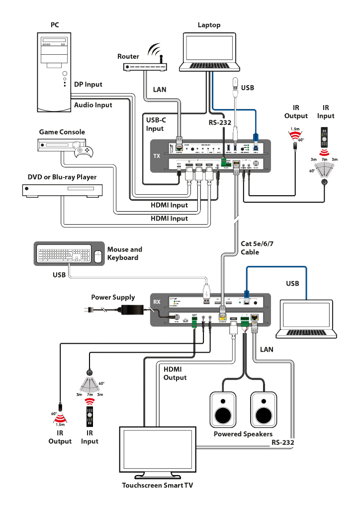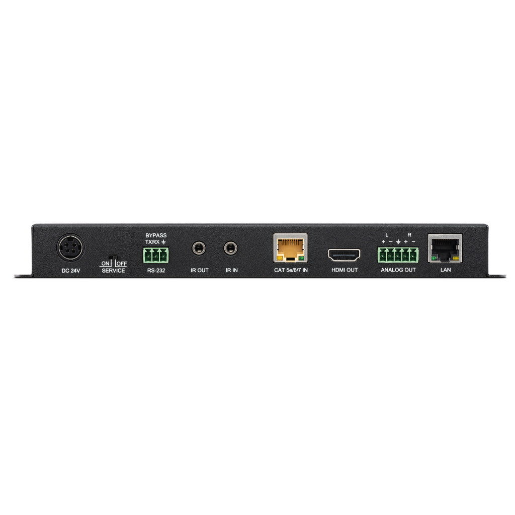 Wandelt das HDBaseT Signal zurück in ein HDMI und USB Signal. Auflösungen bis 1920x1200, 1080p 4K@60Hz (4:2:0 8-bit) möglich. Unterstützte HDBaseT Funktionen: 4K Video, 100 Mbit Ethernet, IR, RS232, USB und PoH 48V.