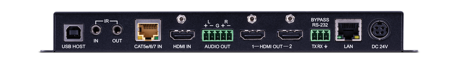 Wandelt das HDBaseT Signal zurück in ein HDMI Signal. Mit dem zusätzlichen HDMI Eingang können die Signale umgeschalten werden. Die eingebaute Kreuzschiene 2x2 ermöglicht die individuelle Signalzuweisung bei beiden Ausgängen. Auflösungen bis 1920x1200, 1080p 4K@60Hz (4:2:0 8-bit) möglich. Unterstützte HDBaseT Funktionen: 4K Video, 100 Mbit Ethernet, IR, RS232, USB und PoH 48V.