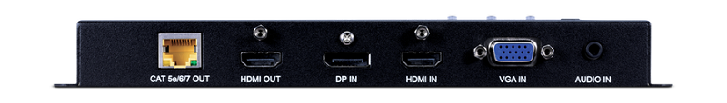 Erlaubt den Anschluss von 1 Display Port, 1 HDMI sowie 1 VGA-Signal mit analogen Audio und gibt dieses als HDMI und HDBaseT Signal aus. Auflösungen bis 1920x1200 oder 1080p können bis 100m übertragen werden. 4K@60Hz (4:2:0 8-bit) bis 70m mit einen CAT6/ 7 Kabel.