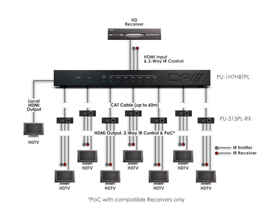 Ermöglicht es, eine HDMI1.4/ HDCP1.1 Signalquelle auf 7 HDBaseT LITE Ausgänge und 1 HDMI Wiedergabegerät auszugeben. Übertragung von HDMI und IR bis 60m via CAT5e, CAT6 und CAT7 und max. 10.2 Gbps möglich. Kann nur mit den PU-515PL-RX verwendet werden. Liefert für den PU-515PL-RX Strom über CAT Kabel via PoE.