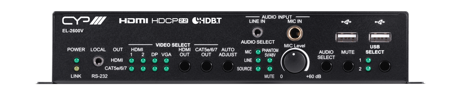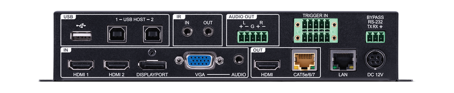 Erlaubt den Anschluss von 1 Display Port, 2 HDMI sowie 1 VGA-Signal mit analogen Audio, USB und gibt dieses als HDMI, HDBaseT, symmetrisches analog Audio und USB Signal aus. Die eingebaute Kreuzschiene 4x2 ermöglicht die individuelle Signalzuweisung bei den beiden Ausgängen. Auflösungen bis 1920x1200, 1080p 4K@60Hz (4:2:0 8-bit) möglich. Unterstützte HDBaseT Funktionen: 4K Video, 100 Mbit Ethernet, IR, RS232, USB und PoH 48V. Mikrofoneingang unterstützt 48V/5V phantom power.