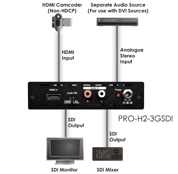 Der Converter wandelt ein HDMI-Signal, optional ein 2-Kanal-Audio-Signal, auf ein SD, HD-SDI, 3G-SDI Signal und gibt dieses auf einem Ausgang und einem Loop-Ausgang für Entfernungen bis 300m aus.