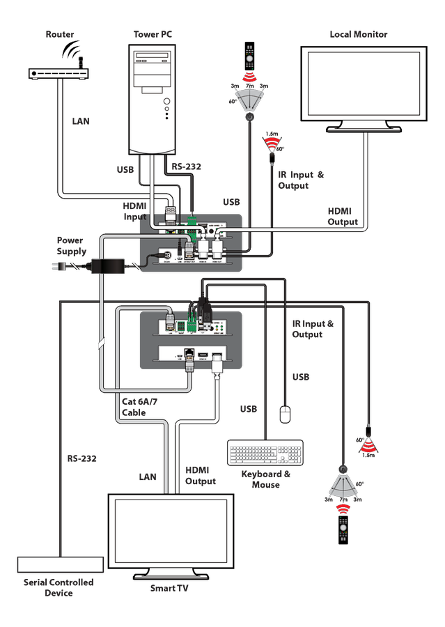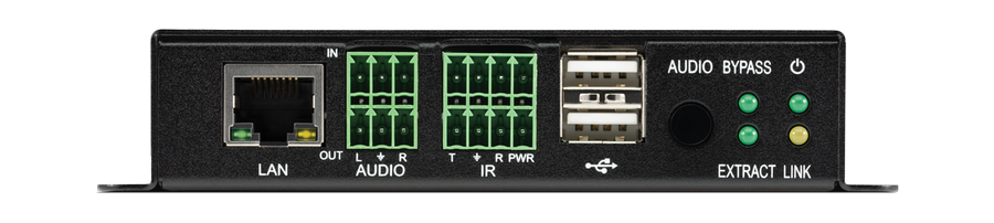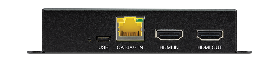 Ermöglicht die Umwandlung eines HDBaseT3.0 Signals zurück das ursprüngliche Signal (max. HDMI2.0a) und gibt dieses wieder aus. Ein analoges Stereo Audiosignal kann zur Übertragung eingespeist werden. Über den Audioknopf kann ausgewählt werden welches Audiosignal (analog od. HDMI 2.0 PLCM) vom Tx übertragen werden soll. Kompatibler Transmitter (z.B. PUV-3090TX-UEA) notwendig. Spannungsversorgung erfolgt über den Tx. Liegt am Rx lokal ein HDMI Signal an, wird dies automatisch am HDMI out ausgegeben (Override HDBaseT).
