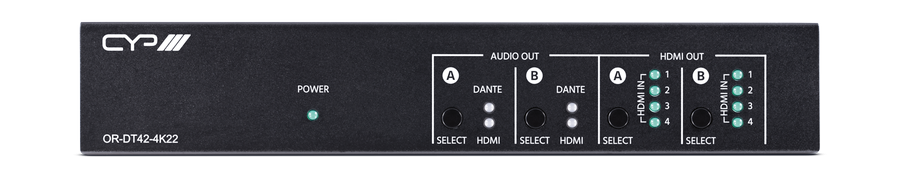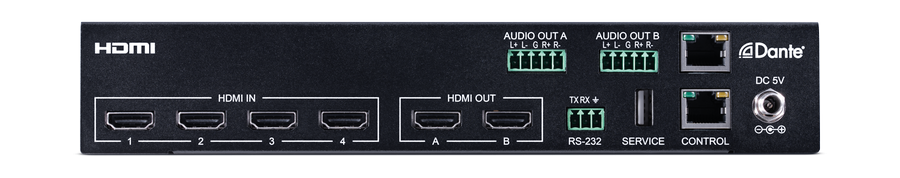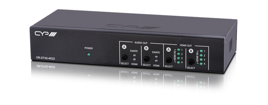 Die OR-DT42 Matrix verbindet Dante Audio Technologie mit einer HDMI 4x2 Matrix. Es wird max. 4K UHD+ (18Gpbs) 4:4:4, 8 Bit mit 8 Kanal LPCM und Dante/AES67 Netzwerk-Audio unterstützt, incl. Embedden und De-Embedden. Die Steuerung erfolgt über das Web-Gui, RS-232 oder Telnet. Für die Dante-Audioverwaltung ist eine Software eines Drittanbieters erforderlich z.B. der Dante Controller von Audinate.