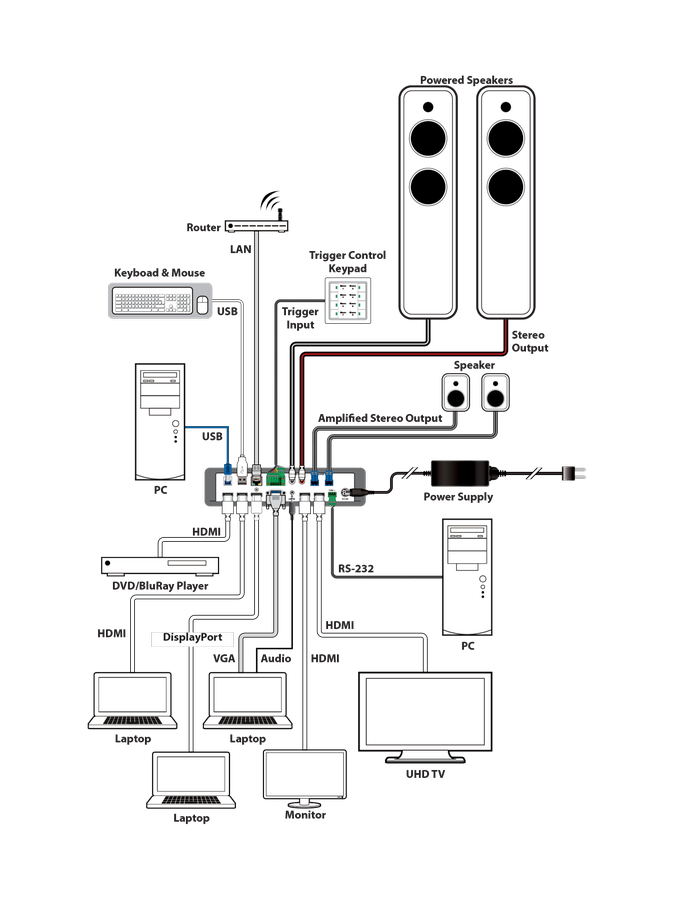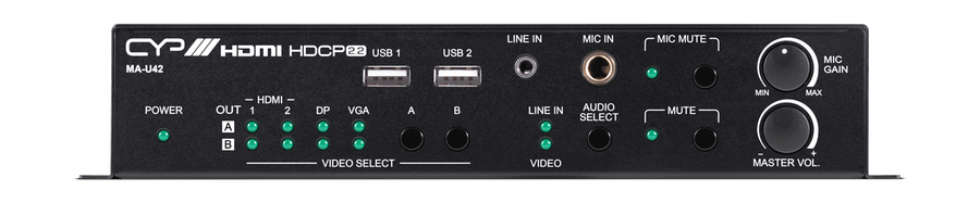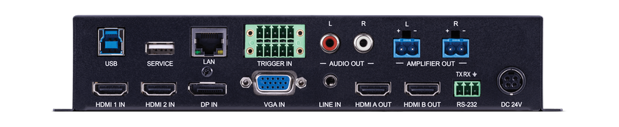 Schaltet 2 HDMI2.0 mit HDCP2.2, Display Port, VGA mit Audio mit einer maximalen Auflösung von 4K/ UHD@60Hz und YUV 4:4:4 auf bis zu 2 HDMI Wiedergabegeräte. Der Mikrofoneingang lässt sich auf die anderen Audioquellen mischen. Der analoge Audioausgang ermöglicht es, das Audiosignal eines ausgewählten Eingangs zu deembedden oder über eingebauten Audioverstärker mit 2 x 20W direkt auf Lautsprecher auszugeben.