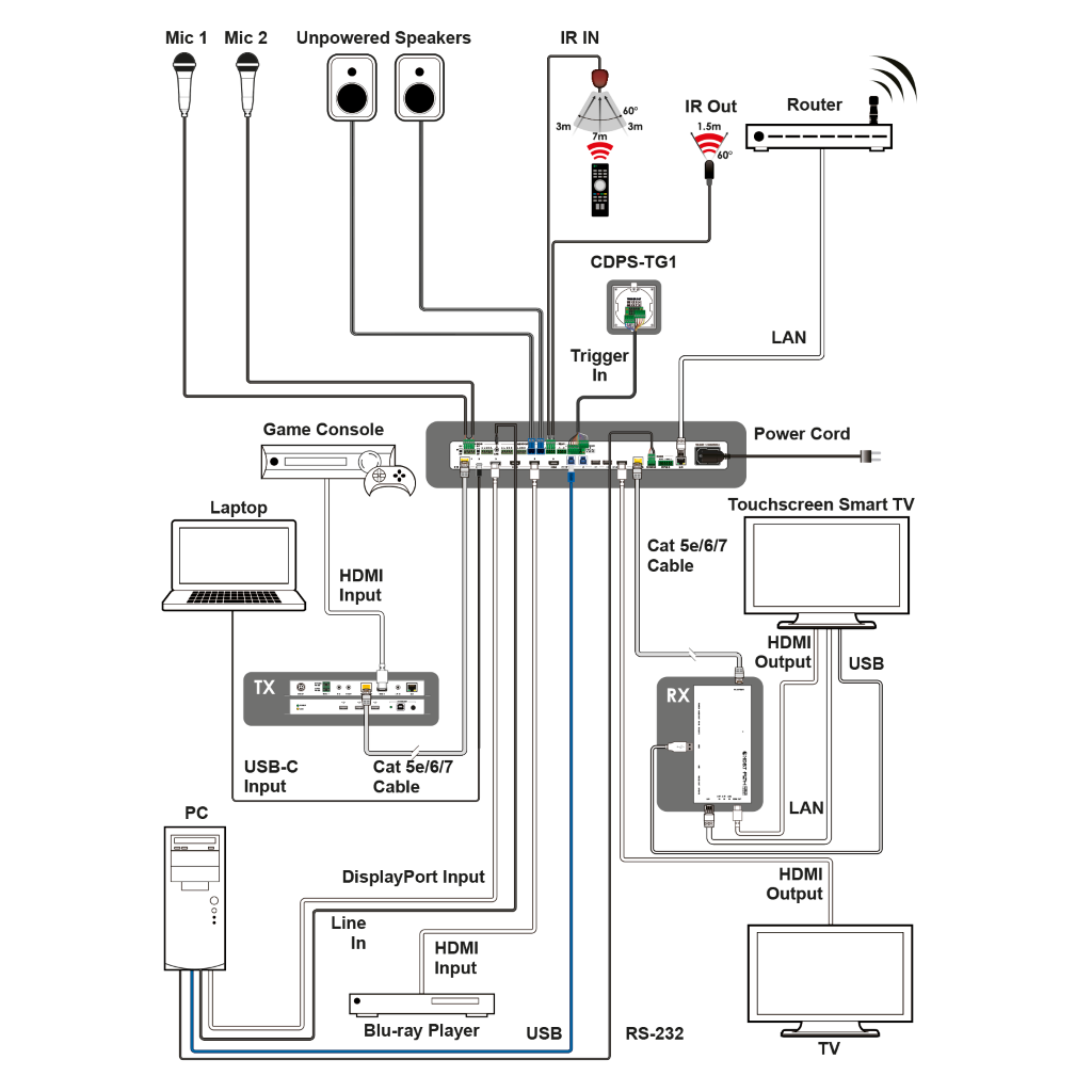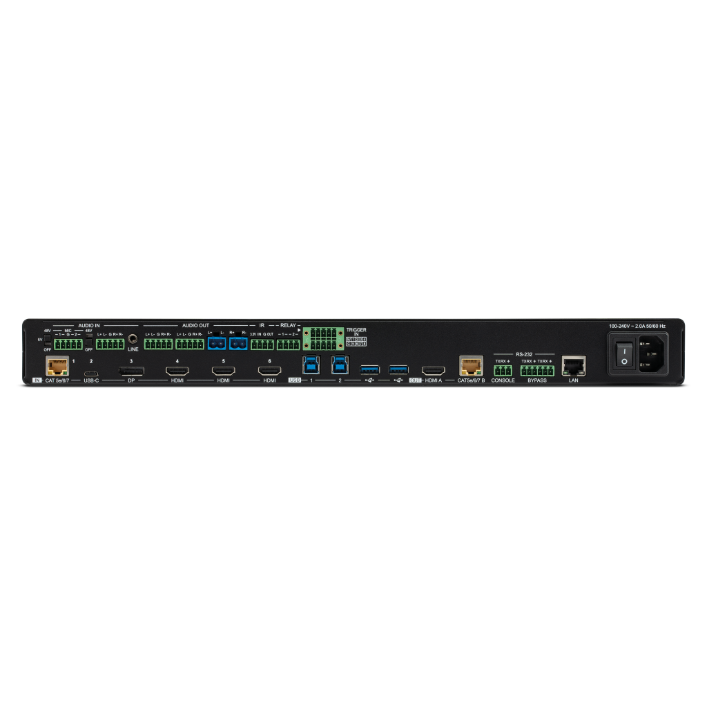 Schaltet mit Seamless-Funktion von 1xUSB-C, 1xDisplayPort, 1xHDBaseT, 4xHDMI2.0/ HDCP2.2 auf HDMI und HDBaseT mit USB. Mit einer Auflösung von bis zu 4K@60Hz 4:4:4 (HDBaseT 4K@60Hz 4:2:0) werden die Signale mit analogen Audio oder verstärkt 2x20 Watt ausgegeben. Der integrierte Audio-Verstärker/Mixer ermöglicht das Mixen von Mic-Eingang und den anderen Audio-Eingängen (ideal für Vorträge) und vereinfacht die Präsentation indem zwischen gemixtem und ungemixtem Audio hin- und hergeschaltet werden kann.