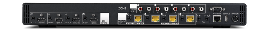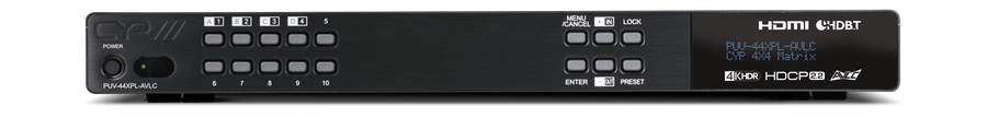 Schaltet 4 HDMI2.0 Signale auf 4 HDBaseTLITE Empfänger PUV-1710LRX-AVLC. Die Matrix unterstützt die Übertragung von Video (bis zu 4K UHD 10/12-bit HDR & Dolby Vision, HDCP 2.2) und Multi-Channel Digital Audio an allen Ein- und Ausgängen. Die AVLC Technologie erlaubt die Übertragung von max. 18 Gbit/s (statt 10,2 Gbit/s). Unterstützt 4K@60Hz (4:4:4 8-Bit) sowie 10/12 Bit mit HDR. Für jeden HDBaseT Ausgang steht ein separater Audioausgang zur Verfügung. Die mitgelieferten HDBaseT Empfänger PUV-1710LRX-AVLC werden über das CAT Kabel (PoH) versorgt, max. 60m (CAT6a,7) bzw. 35m (CAT5e,6).