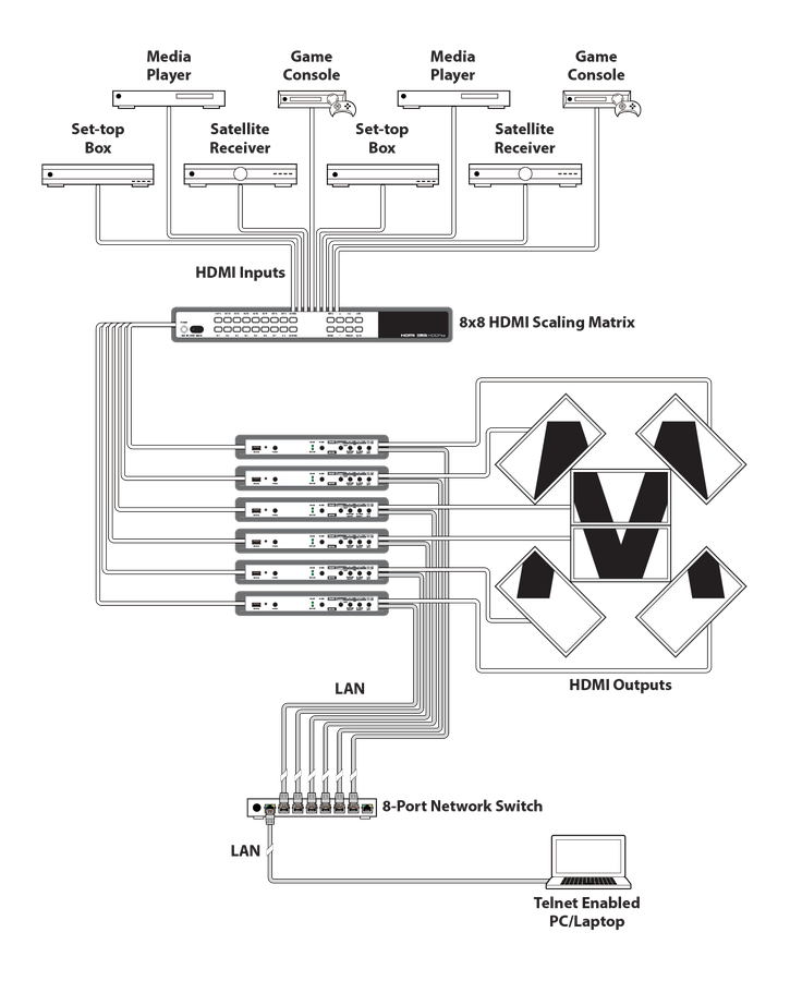 Ermöglicht die Darstellung eines 4K HDMI Signals inkl. Rotation auf einen Wiedergabegerät. In Kombination mit einen HDMI Verteiler/ HDMI Kreuzschiene kann eine Videowandapplikation realisiert werden. Die Latenz zwischen den Controllern beträgt max. 2 frames.