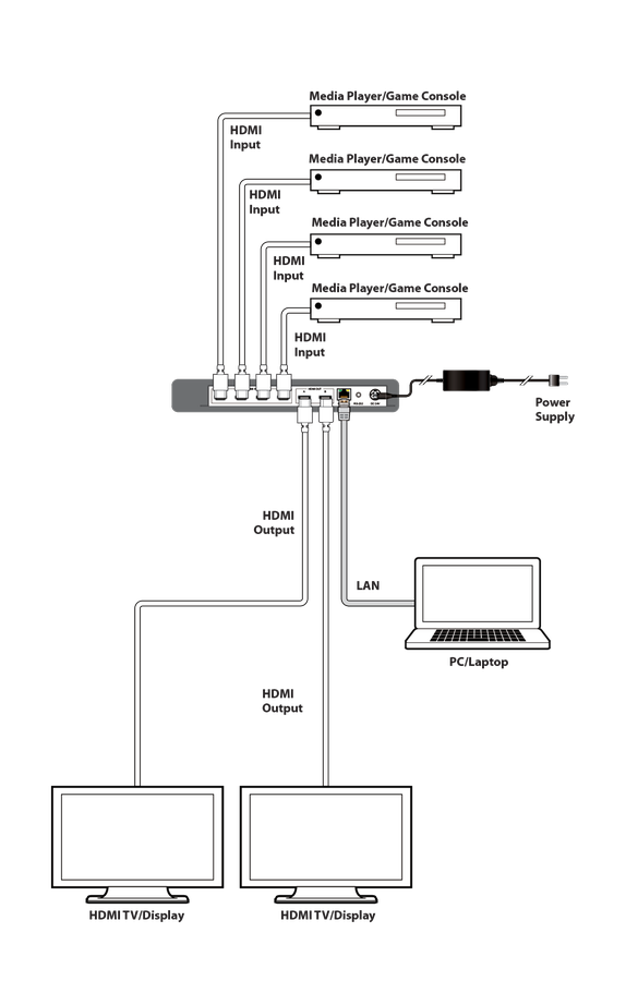 In der Matrixfunktion erfolgt die Umschaltung Seamless. Als weiteres stehen Erweitertes EDID-Management, Separates Audio und benutzerdefinites Logo zur Verfügung.