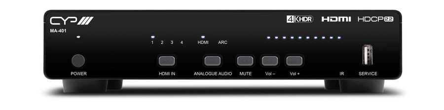 Schaltet 4 HDMI2.0 Signale auf 1 Wiedergabegerät mit der fast switching Technologie. Unterstützt UHD/ 4K und 3D. Kann via Fronttasten, RS232, IR, IP oder mit der CYP Control App gesteuert werden. Eine kleine Steuerung ermöglicht das steuern von IR Geräte. Der eingebaute Audioverstärker mit 2 x 20W erlaubt direkt den Anschluß von Lautsprechern.