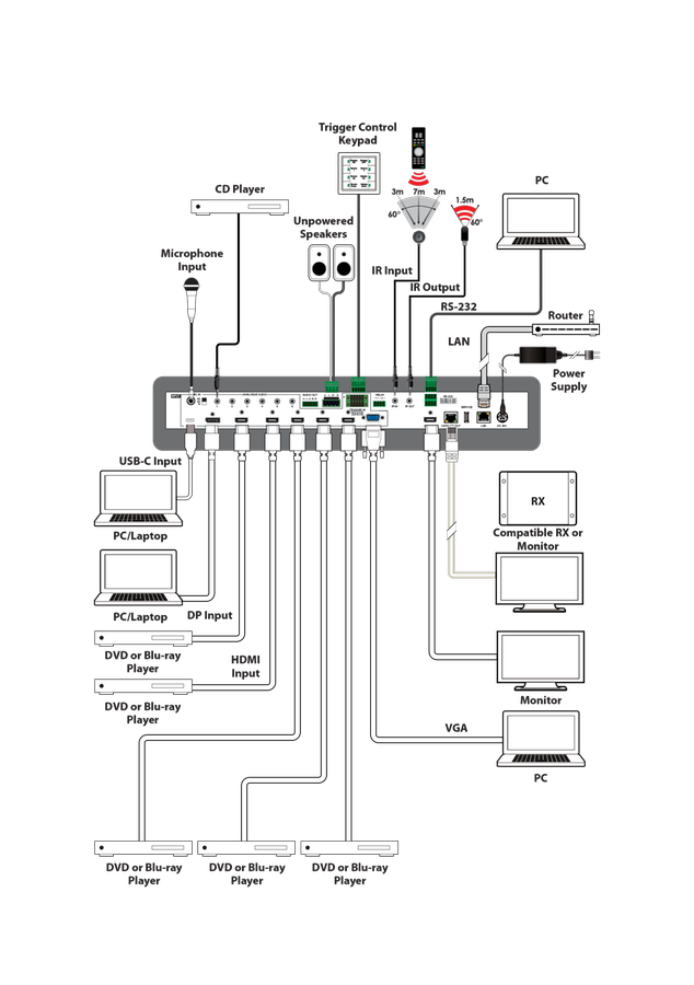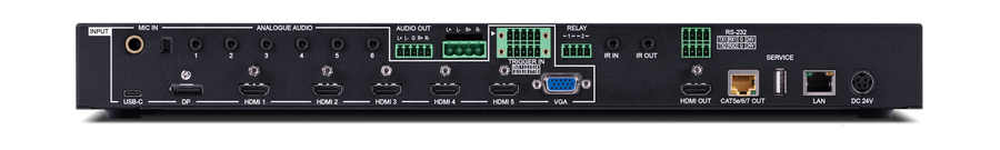 Erlaubt den Anschluss von 1xUSB-C, 5xHDMI2.0/ HDCP2.2, 1xDisplayPort, 1xVGA und gibt dieses als HDMI und HDBaseT Signal aus. Mit einer Auflösung von bis zu 4K@60Hz 4:4:4 werden die Signale mit analogen Audio oder verstärkt 2x20 Watt ausgegeben.