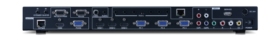 Erlaubt den Anschluss von 3 x HDMI, 3 x VGA mit YCbCr, YPbPr und FBAS mit Audio und gibt dieses als HDMI, HDBaseT und VGA Signal mit 640x480 bis 1920x1200 oder von 480i bis 1080p mit analogen oder digitalen Audio aus.