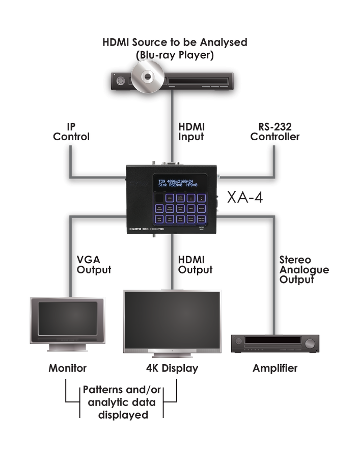 Gibt 47 unterschiedliche Testbilder und 54 unterschiedliche Auflösungen aus. Zusätzlich stehen 6 Analysefunktionen zur Verfügung: HDMI Datenpakete, EDID und HDCP können analysiert werden, EDID emulieren, 2 eigene Testbilder können gespeichert werden und bis zu 8 Audiokanäle ausgegeben werden.