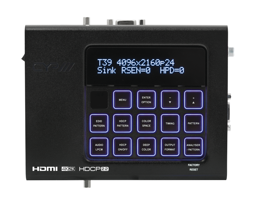 Gibt 47 unterschiedliche Testbilder und 54 unterschiedliche Auflösungen aus. Zusätzlich stehen 6 Analysefunktionen zur Verfügung: HDMI Datenpakete, EDID und HDCP können analysiert werden, EDID emulieren, 2 eigene Testbilder können gespeichert werden und bis zu 8 Audiokanäle ausgegeben werden.
