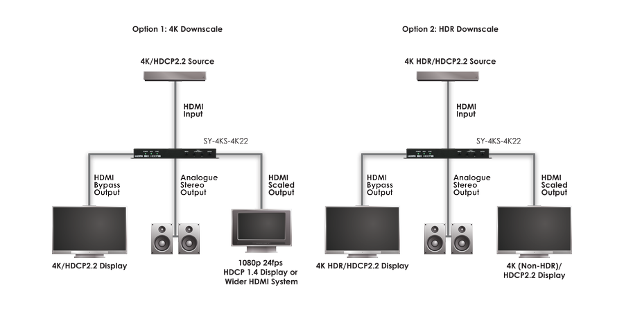 Ermöglicht es, ein HDMI Signal mit 1080p auf UHD/ 4K (HDMI2.0) zu skalieren oder UHD/ 4K (HDMI2.0) auf 1080p runter zu skalieren. Zusätzlich wird HDCP2.2 auf einen niedrigeren HDCP Standard konvertiert. Damit können Wiedergabegeräte mit einen älteren HDCP1.4 Standard eingebunden werden.