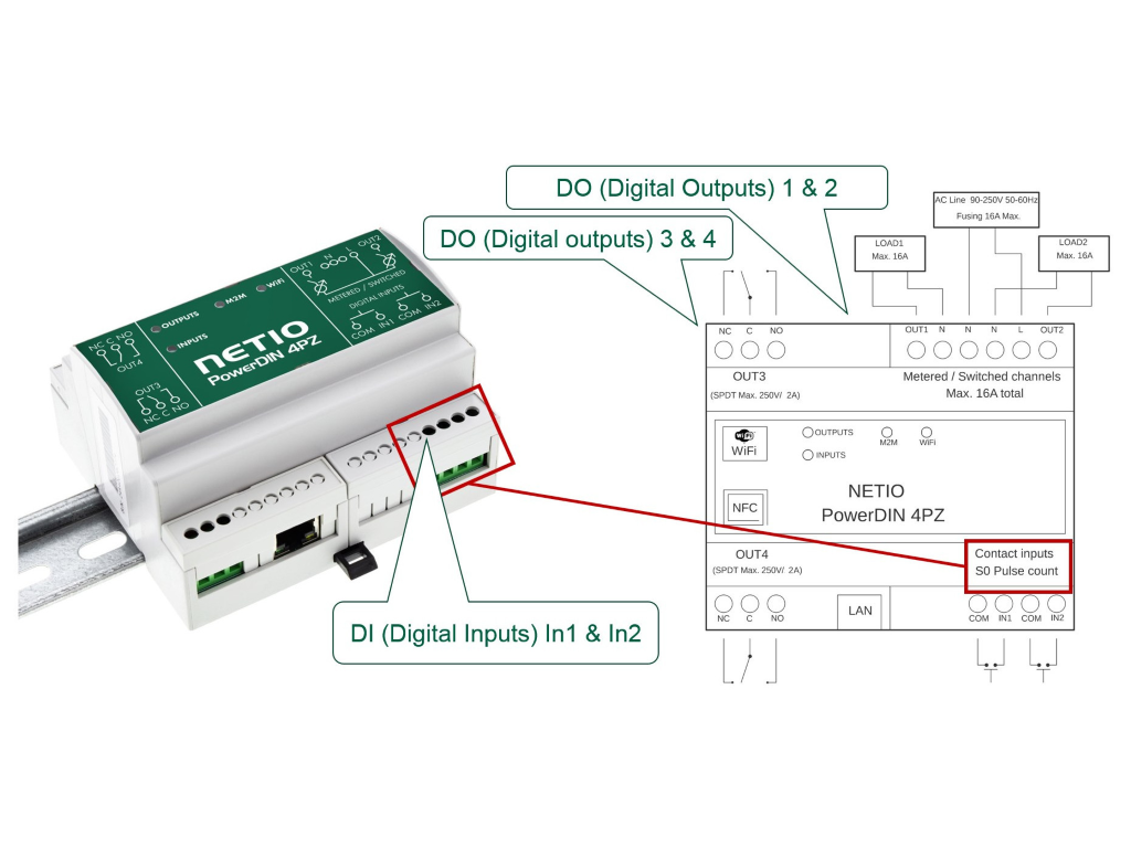 LAN, WLAN (Web interface, Open API, NETIO Cloud service, NETIO Mobile 2), Digitaler Input
