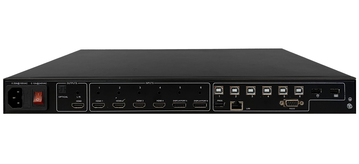 Verarbeitet max. 4 HDMI 2.0 (3840x2160@60Hz), 2 DisplayPort 1.2 (3840x2160@60Hz) Signale mit Audio und kann max. 4 Quellen gleichzeitig an einer HDMI 2.0 fähigen Senke angezeigt werden. Es werden auch Quellen mit mehreren Ausgänge (Multi-head) unterstützt. Die KVM Funktionalität erlaubt es mit eine Tastatur und Maus bis zu 4 Quellen zu bedienen. Es stehen 16 feste sowie 16 frei programmierbare Presets zur Verfügung. Ein wählbares Audiosignal kann de-embedded und als Stereo-Analog oder optisches Signal ausgegeben werden. 6 Analog Audio Eingänge stehen ebenfalls zur Verfügung. Kompatibel zu HDCP 2.2 und 1.4.