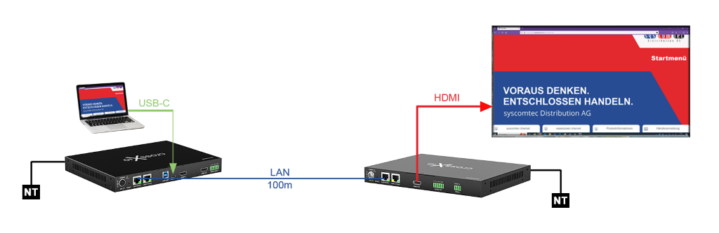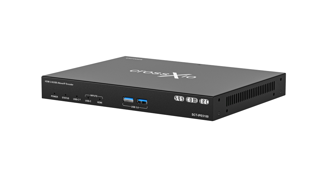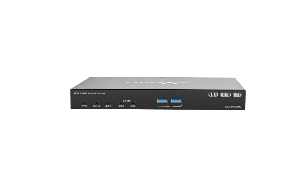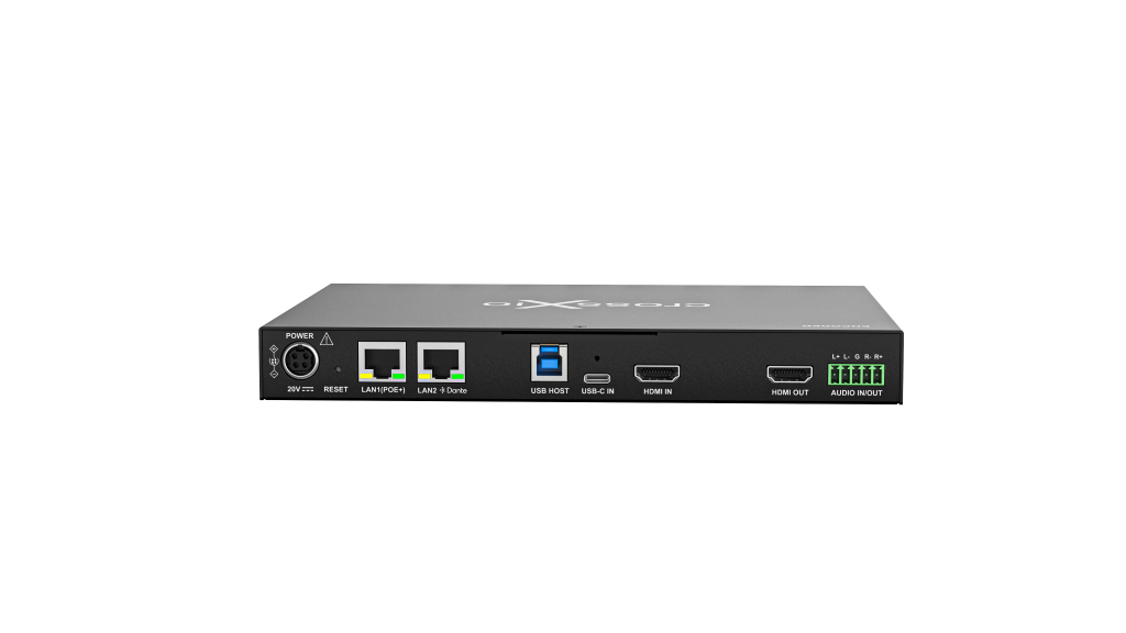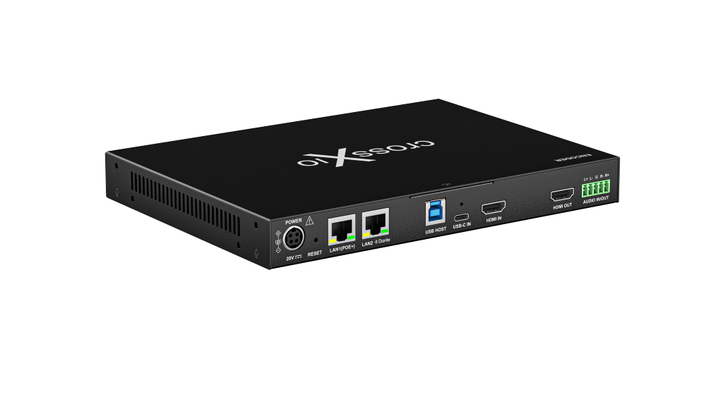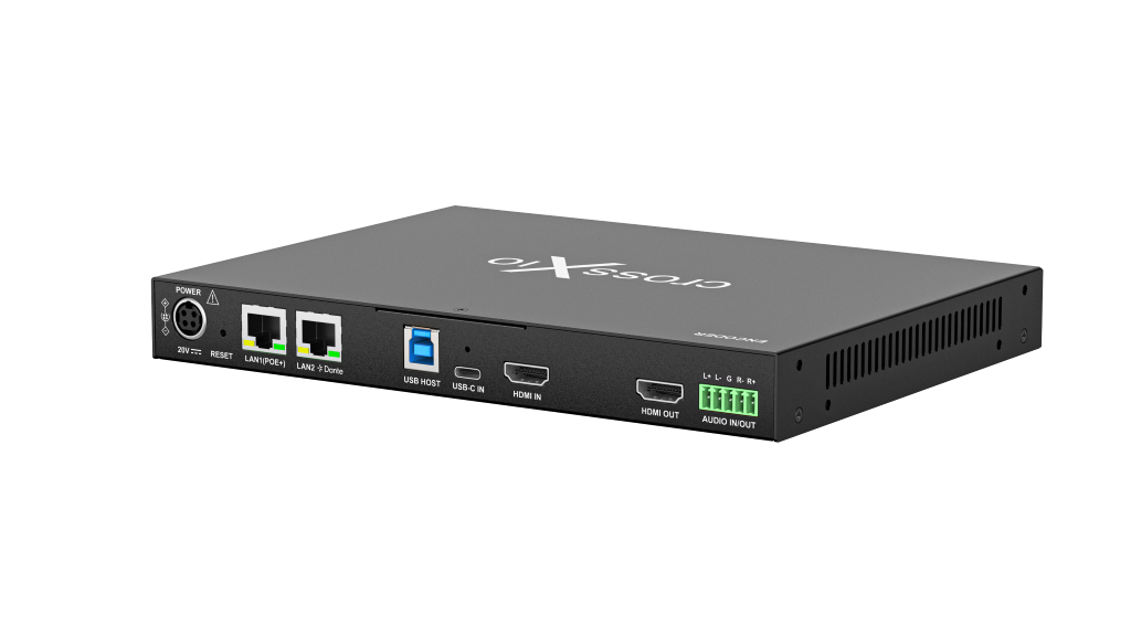Der AVoverIP Encoder aus der 1G crossXio Serie ermöglicht die Übertragung und Umschaltung ohne spürbare Latenz eines USB-C (100 Watt optional) oder HDMI2.0 Videosignals mit analogem oder Dante/AES67 Audio und USB2.0/1.1. Der USB-C & HDMI Eingang kann via Autoswitching mit Prioritätsschaltung oder Ethernet gesteuert werden. Das System unterstützt Auflösungen bis 4K@60Hz 4:4:4 mit HDMI2.0, ARC/eARC, HDR10/10+, Dolby Vision, CEC, HDCP2.3/1.4. Bidirektionales Audio embedding/deembedding für symmetrisches analoges Audio, Dante oder AES67. Mit USB3.0 2 fach Hub und USB2.0/1.1 Übertragung mit KVM Routing/ ausgelegt für USB2.0 Kameras. Die Stromversorgung erfolgt über PoE+. USB-C Eingang 100 Watt mit mit optionalen Netzteil verfügbar.