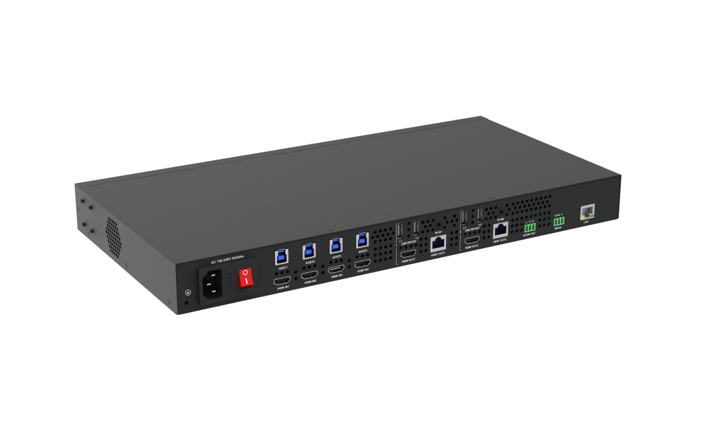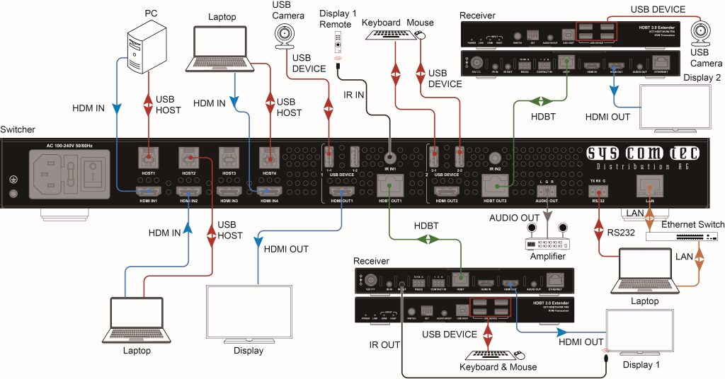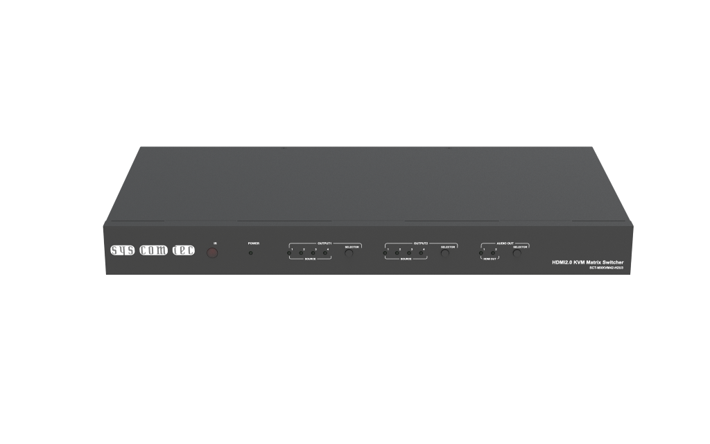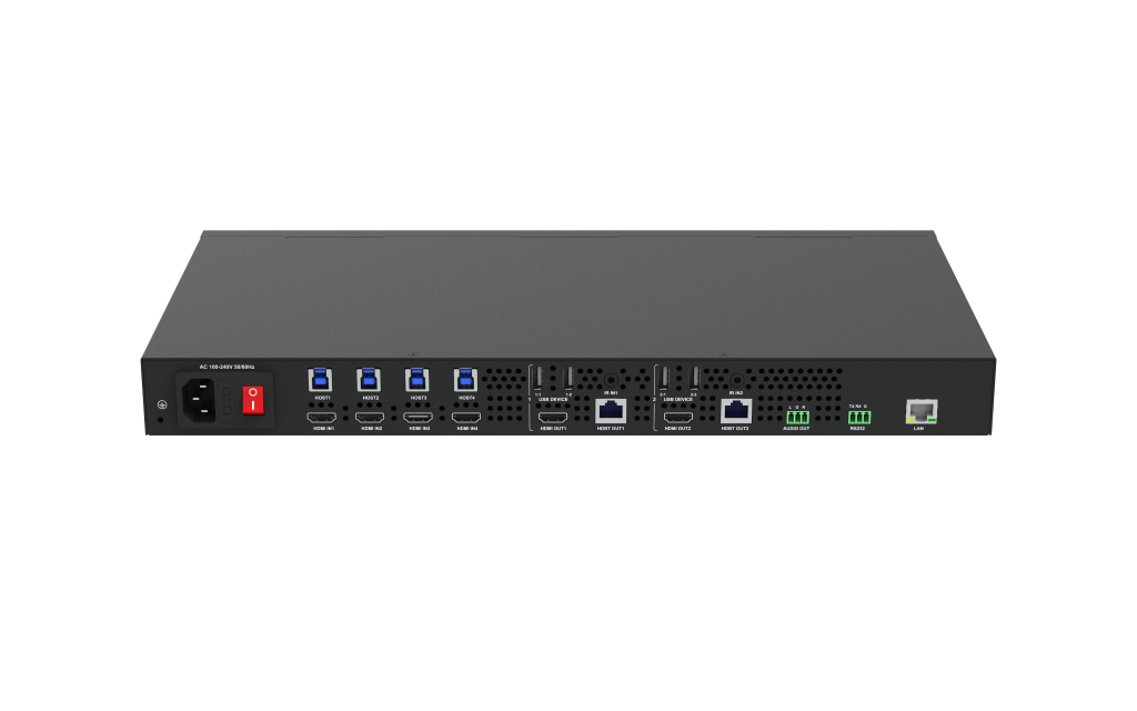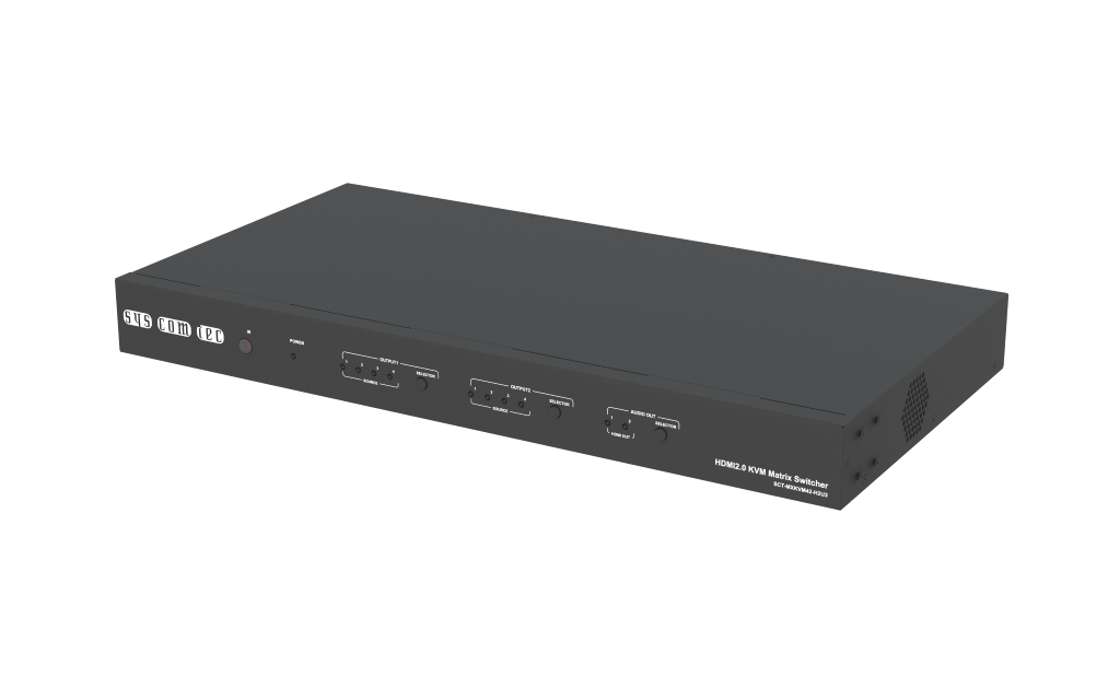 Schaltet 4 HDMI2.0/ DVI-D mit max. UHD/ 4K@60Hz (YUV 4:4:4) mit USB3/2/1 auf 2 HDMI/ HDBaseT3 und USB3/2/1 Ausgänge. Mit den passenden HDBaseT3 Transceiver SCT-HDBT3KVM-TRX wird HDMI, Ethernet, RS232, IR, USB2.0 übertragen. Übertragungsdistanzen betragen mit CAT5e (bis 70m) bzw. mit CAT6a/ CAT7 (bis 100m). In Verbindung mit den Transceiver (kann als Sender oder Empfänger konfiguriert werden) hat jeder Ausgang einen 6 fach USB Hub. Matrix liefern via PoE Strom für beide Transceiver. Mittels Audio Deembedding wird das Audiosignal über einen analogen Audioausgang ausgegeben. Kann via Fronttasten, RS232 oder TCPIP gesteuert werden.