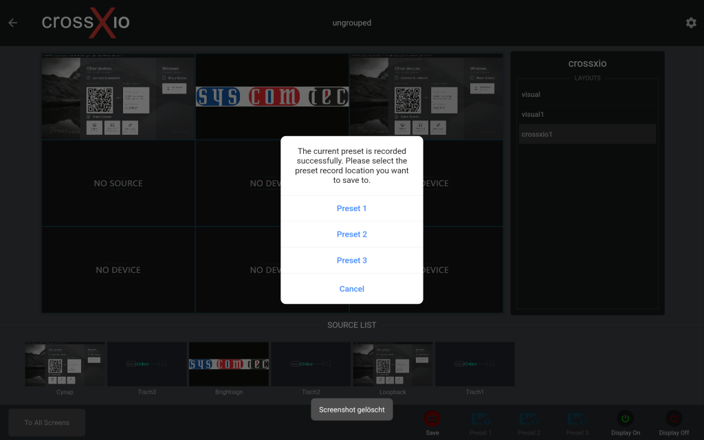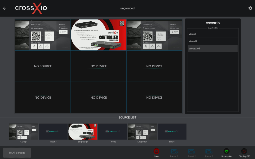 Die crossXio Control Android App ist eine vielseitige Anwendung zur Steuerung und Verwaltung von AVoIP-Videoquellen, Displays und Video-Wall-Layouts über eine intuitive Benutzeroberfläche. Die App ermöglicht es, Video-Quellen dynamisch auf mehrere Displays zu verteilen und Videowall-Setups einfach zu konfigurieren und zu steuern. Über Drag-and-Drop-Funktionen lässt sich bestimmen, welcher Inhalt auf welchem Bildschirm dargestellt wird, was die Einrichtung und Anpassung von visuellen Installationen erheblich vereinfacht. Es stehen vordefinierte Layouts zur Verfügung, die schnell ausgewählt und gespeichert werden können, sowie Funktionen zum Ein- und Ausschalten von Displays direkt über die App. Erweiterte Einstellungen erlauben es, bestimmte Geräte auszublenden oder gezielt anzuzeigen, um benutzerdefinierte Visualisierungsanforderungen optimal umzusetzen. Es muss der crossXio Controller SCT-IPCX vorhanden sein.