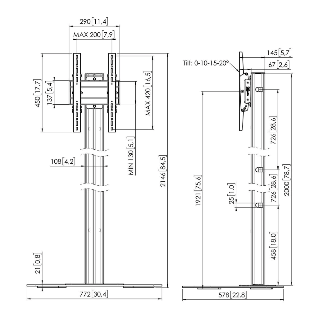 Der F2022V ist ein eleganter Bodenstandfuß für max. 65" Displays mit einen max. Gewicht von 60kg. Das Display kann in jeder gewünschten Position auf dem Profil befestigt und bis zu 20 Grad geneigt werden. Und dank des Kabelführungssystems verschwinden sämtliche Kabel aus dem Sichtfeld.