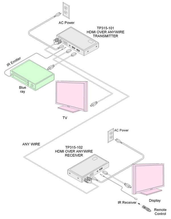 Transmission 4K HDMI (max. UHD@30Hz) and IR signal with 2 any wire cables. The system support the HDCP and fixed EDID informations.