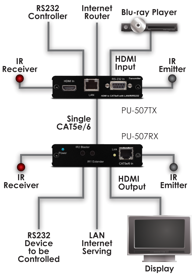 Allows the conversion of a CAT signal back into a HDMI (max. 4k, 2k and 1080p) incl. audio or DVI signal, HDMI, CEC, LAN, IR and RS232 tw signals with 1UTP CAT5 (up to 80m) or CAT6/7 (up to 100m) cable with HDBaseT technology. Only in conjunction usable with PU-507-TX, PU-507TX-HDVGA, PU-507-TX1H, PU-8H8CTX, PU-8H8CTXIR and PU-8H8HBT. Full HDCP and PoE compatible. Transmission of 4k, 2k or 1080p@60Hz.