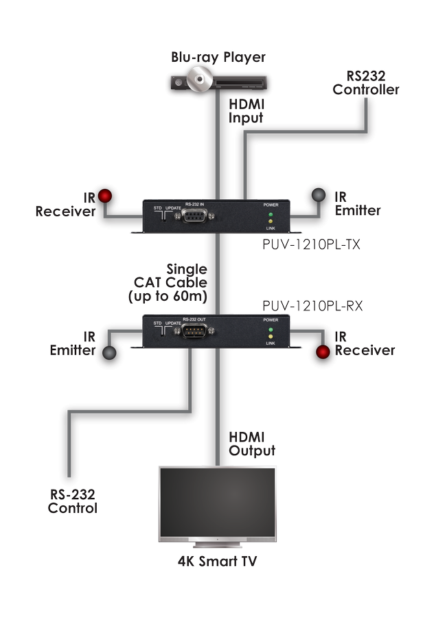 Allows the conversion of a HDBaseT2.0 signal back into a HDMI2.0/ HDCP2.2 (max. UHD/ 4K/ 1080p@60Hz), Audio, USB2.0, LAN, IR und RS232 tw signals with 1 CAT6a/ 7 (up to 60m) cable. The system support the HDBaseT2.0 specification with the 5 Play technology. Full HDCP compatible. Transmitter PUV-1210TX deliver the power PoH (Power over HDBaseT) for Receiver.