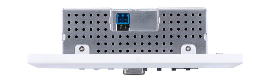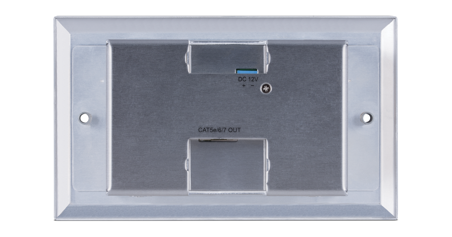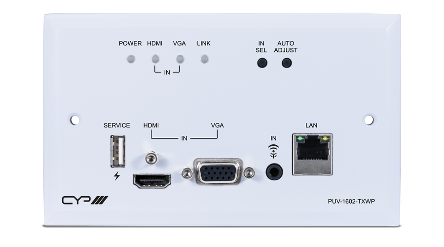 The PUV-1602TXWP Wallplate Transmitter is a HDMI/VGA switch which allows uncompressed HDMI and VGA signals to be transmitted over a Single CAT5e/6/7 cable. This solution has the added features of analogue audio em-bedding, RS-232 and 2-way IR control functionality over the same CAT5e/6/7 cable. These combined HDMI and control signals can be transmitted up to lengths of 100 metres to a compatible PUV 1600 Series Receiver. This unit also supports automatic input detection between the HDMI and the VGA inputs using hot plug detection, offering the user -hands free- control of the device. Despite the 10.2Gbps bandwidth limitation of HDBaseT this clever transmitter will automatically convert signals of higher bandwidths ensuring any HDMI 4K signal can be passed through the HDBaseT system. The unit also features push button control on the front of the panel. The unit is powered by PoH supplied by a compatible PUV-1600 series receiver. The wall plate is designed to integrate within a standard UK double gang back box.