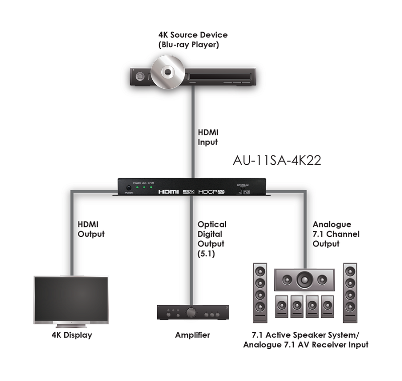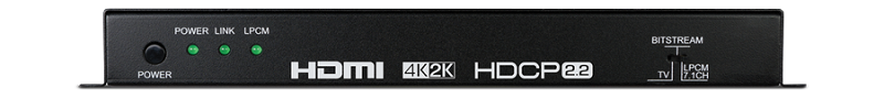 Converter/ Deembedder for HDMI2.0, HDCP2.2 to HDMI2.0, HDCP2.2 and a Toslink or analog Audio (Stereo Audio, 5.1, 7.1) out. The build in Repeater extend the HDMI signal with UHD/ 4K@60Hz up to 5m.