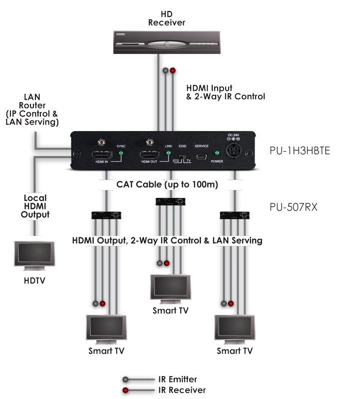 Accepts one HDMI1.4 input and splits this signal to three HDBaseT and one HDMI outputs. Transmission from HDMI, LAN, PoE and IR up to 100m via CAT5e, CAT6 and CAT7 and max. 10.2 Gbps. The PU-507-RX, PU-507-RXSCD, PU-507-RX2H, PU-507-RX2HCD, PU-HBTE-ZE and PU-507-WPRX Receivers are recommended to utilise the functionality of the HDBaseT™ outputs of this device.