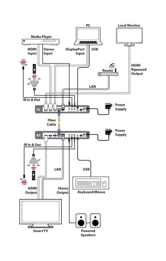 The LAN Transceiver (SDVoE) support the transmission from a HDMI2.0 (UHD 3840x2160@60Hz 4:4:4) or DisplayPort1.2 with RS232, IR, Audio, LAN 1 Gbit and a USB1.1/ 2.0 about 2 Multimode Fiber.