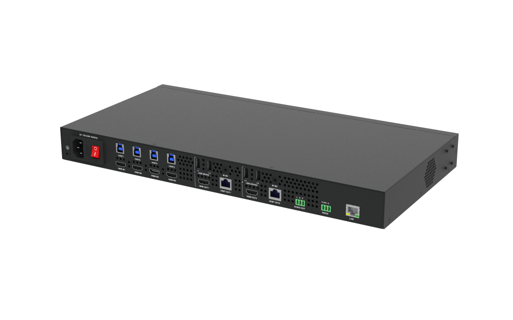 This product is a 4x2 HDMI2.0 KVM matrix switcher that supports full 4K and USB 3.0/2.0 matrix switching between four HDMI inputs and two groups of HDBT and HDMI outputs. It can transmit 4K@60Hz signals up to 100m/330ft via a single Cat 6a/7 cable. It also features not only basic functions like cross-point switching and control (IR, RS232, LAN), but also advanced functions like auto-downscaling for each HDMI output when it is connected to 1080P display. With four USB host ports, two groups USB devices and remote USB devices, the device also supports multiple USB connections for easy management.