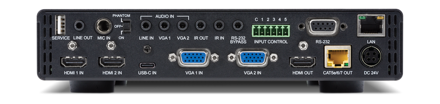 This HDMI/DisplayPort/VGA to HDMI Scaler with HDBaseT LITE Output is designed to switch and scale up to 5 AV inputs to simultaneous HDMI and HDBaseT LITE outputs at resolutions up to 1080p/WUXGA. The HDBaseT LITE output enables the user to send the signals up to 60m over a single CAT5e/6/7 cable and supports PoC (Power over Cable) to provide power to the connected HDBaseT LITE receiver (PU-515PL-RX or PU-515PL-WPRX). Additionally, this device offers 3 analogue Line level audio inputs, a switchable Microphone input and a Line level output. The microphone input features a 48V Phantom power mode for use with professional microphones. The audio DSP engine provides auto-mixing and auto-gain control to mix or reduce the background audio in order to enhance the main audio source. The system can be controlled and easily configured via WebGUI, IR remote control or RS-232. This device is an ideal solution for presentation facilities within a classroom and/or conference room.